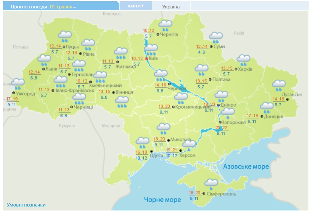 1 мая в Украине будет прохладная и дождливая погода, а в некоторых городах даже возможны локальные подтопления.