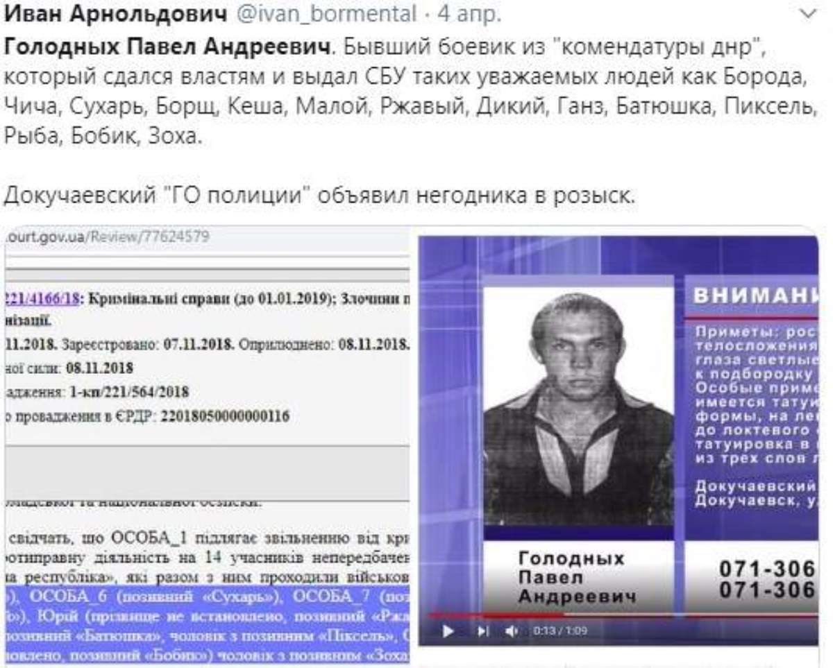 Между тем, сторонники «русского мира» сообщают в социальных сетях, что «полиция» квазиобразования ДНР объявила в розыск бывшего боевика своей «комендатуры» Павла Андреевича Г., который выдал СБУ целую группу других террористов: