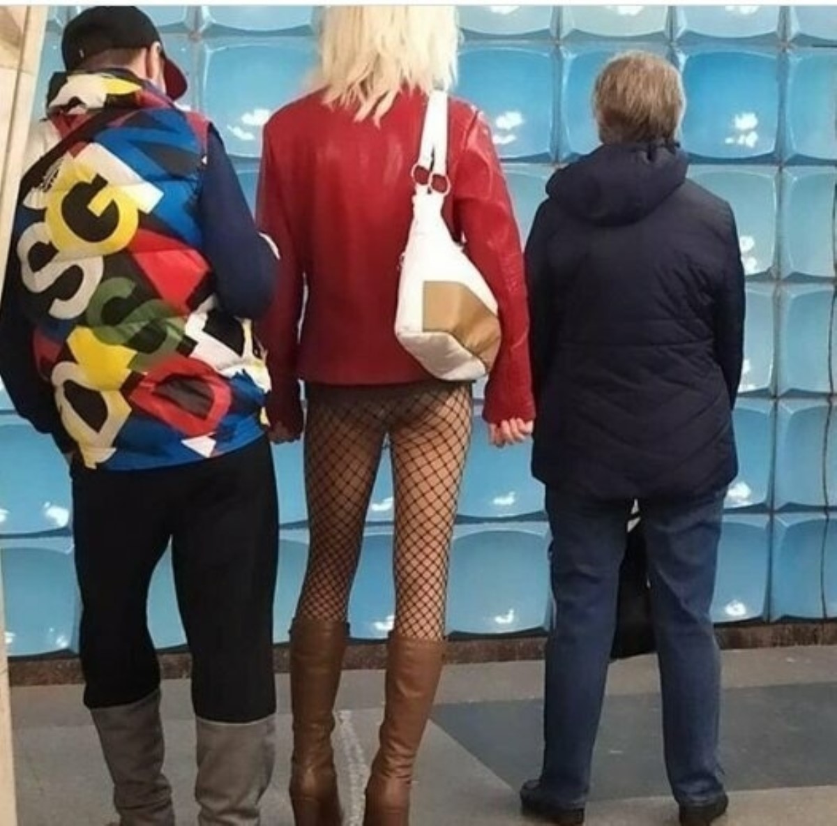 В метро Харькова одна из пассажирок ехала в колготках в крупную сетку и без юбки.