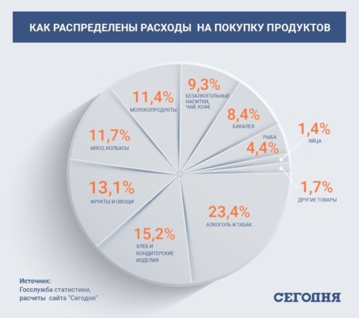 Интересно, что 80% купленных населением продуктов были отечественного производства и только 20% – импортированные. Больше всего это касается куриных яиц – 99% их снесены украинскими курами-несушками. Также мы истратили 97,5% денег на украинское мясо и только 2,5% – на импортное. То же касается 96% – сахара, по 93,6% – колбас и поваренной соли, 95% – молока, 93% – хлеба.