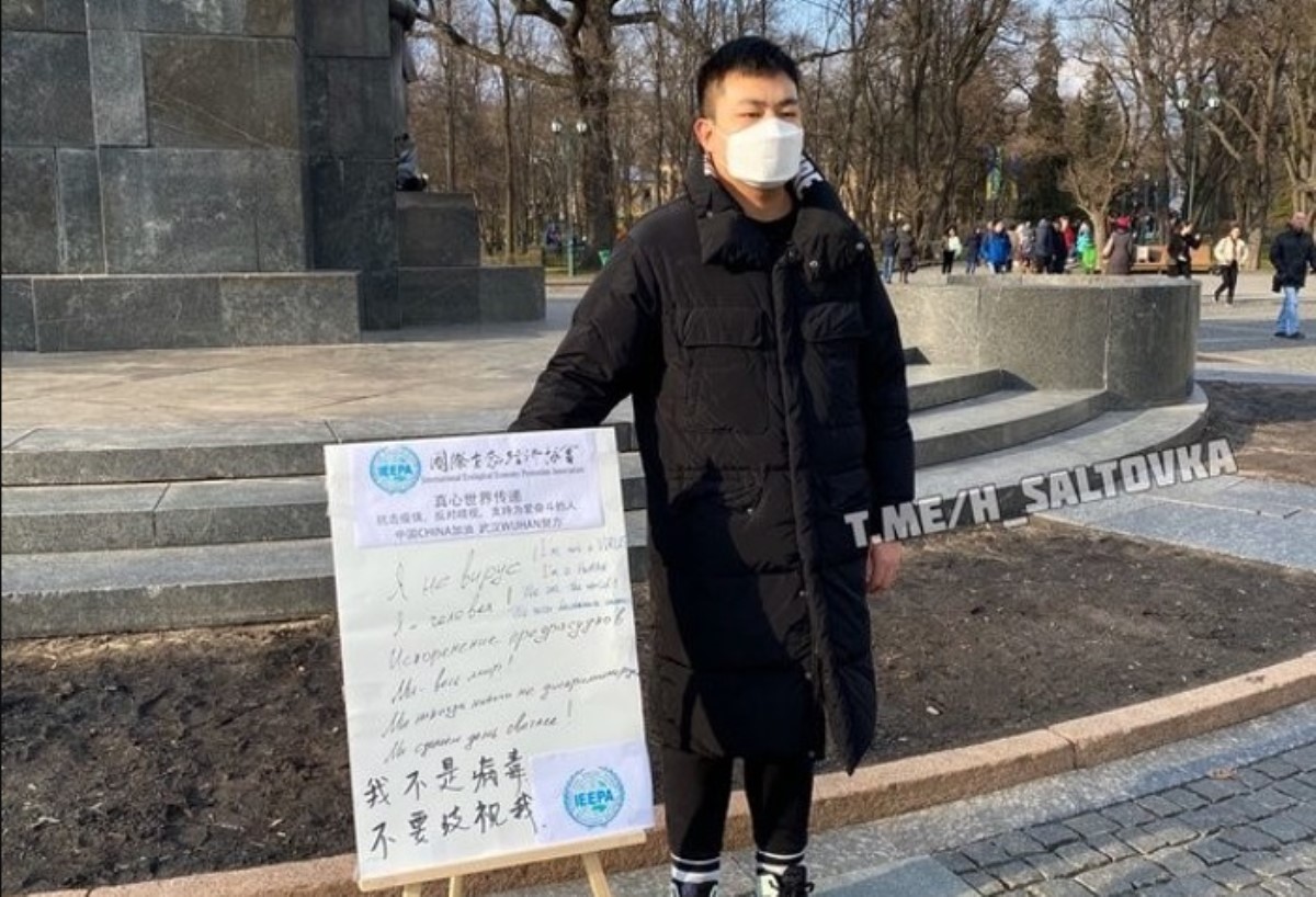 В центре Харькова к памятнику Тарасу Шевченко на улице Сумской вышел китаец с транспарантом в руках для высказывания протеста против дискриминации в связи с эпидемией коронавируса.