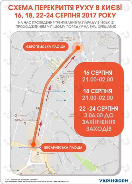 На время проведения тренировки и самого парада войск с прохождением в пешем порядке на ул. Крещатик – участок от Бессарабской до Европейской площади – движение будет ограничено в такие часы:
