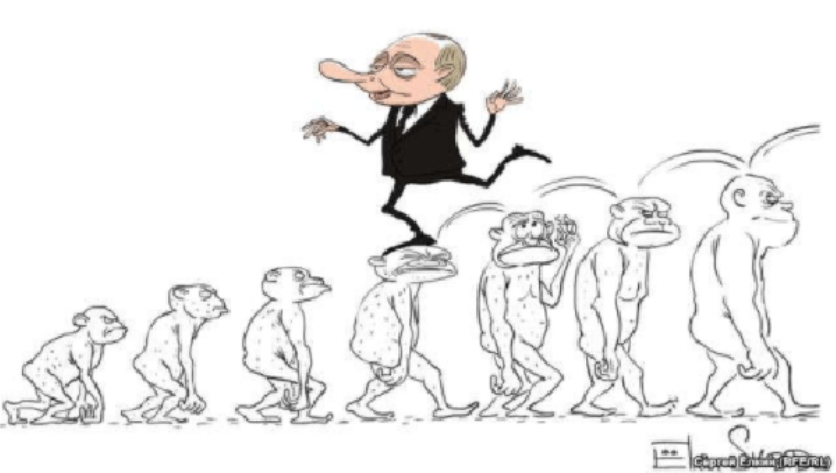 В карикатуре Путин стал героем известного рисунка, изображающего эволюцию человека от сгорбленного обезьяноподобного существа до современного человека.
