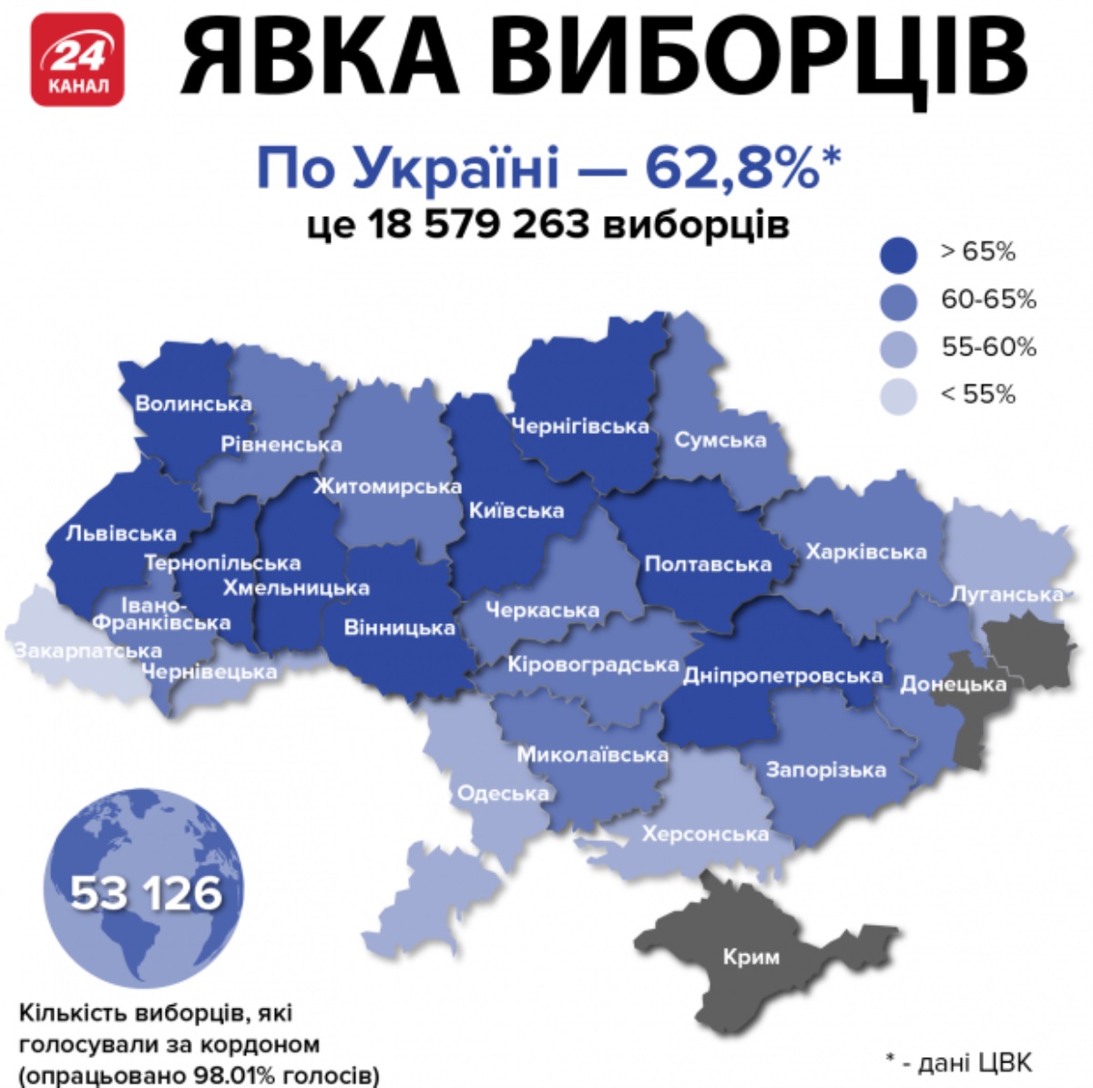 По состоянию на 20:00 31 марта, в Украине проголосовали 62,8% избирателей на 199 округах. Всего в стране насчитывается 26 миллионов 770 тысяч 419 человек, которые могут голосовать.