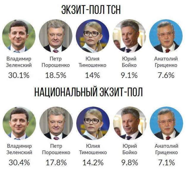 Интересно, что экзит-полы показали завышенные результаты у президента Петра Порошенко, однако показали весьма точный результат у Владимира Зеленского.