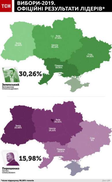 Так, в Винницкой, Волынской, Днепропетровской, Житомирской, Закарпатской, Запорожской, Киевской, Кировоградской, Николаевской, Одесской, Полтавской, Сумской, Харьковской, Херсонской, Хмельницкой, Черкасской, Черновицкой, Черниговской областях и в Киеве лидирует Владимир Зеленский.