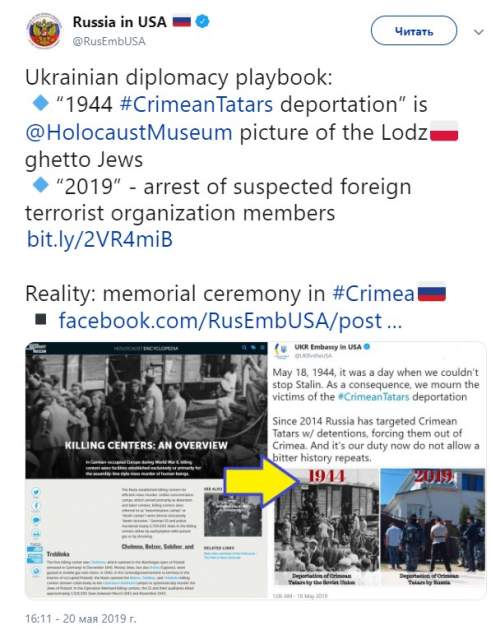 Украинское посольство в США обнародовало фотографию из музея Холокоста, выдав ее за кадр депортации крымских татар в 1944 году, пишет российское посольство в Вашингтоне в своем Twitter-аккаунте.