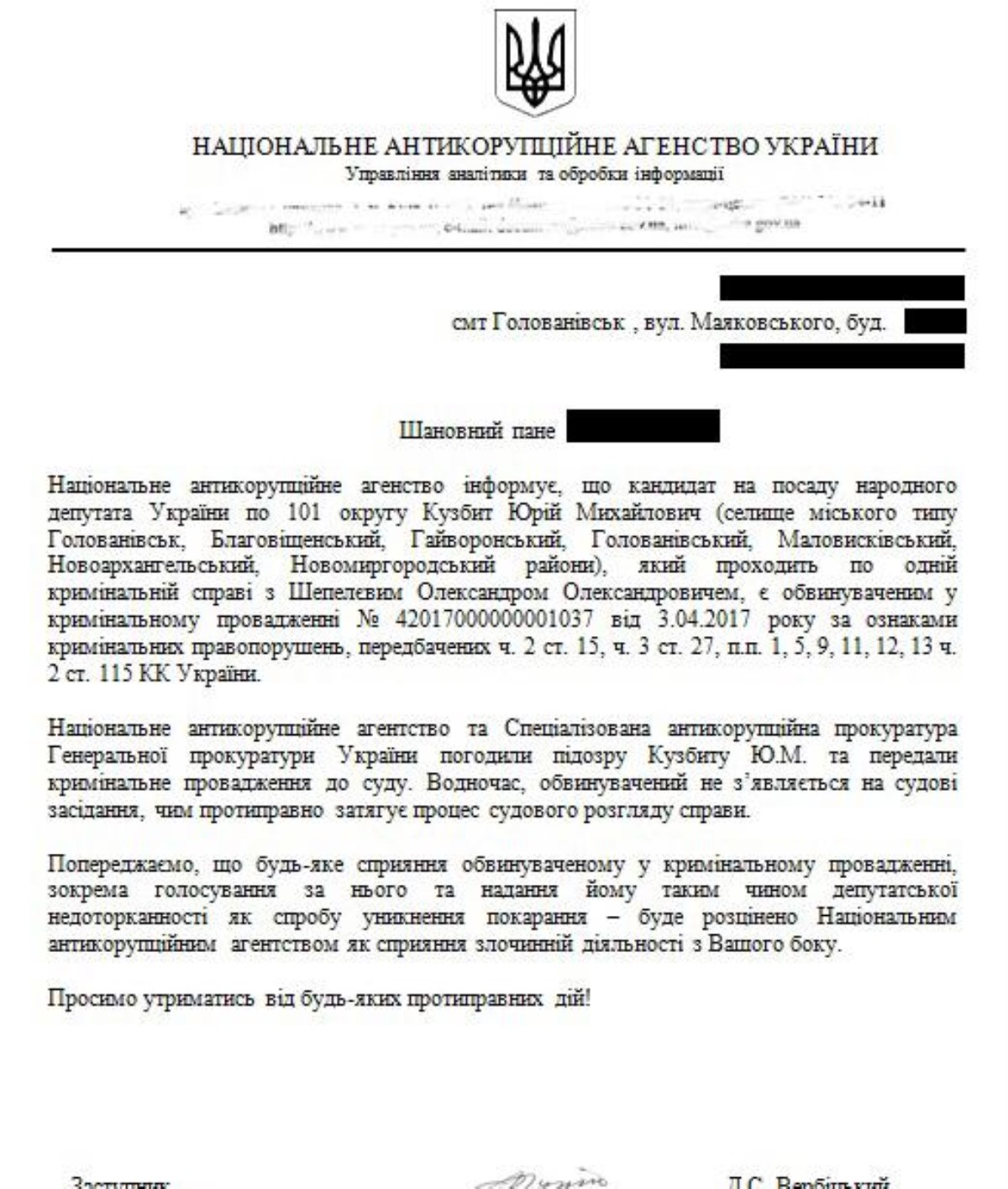 Из письма НАБУ явствует, что Кузбит Юрий Николаевич является обвиняемым в уголовном производстве, заведенном на Шепелева А. А. №42017000000001037 от 03.04.2017 по ч.2 Ст.15, ч.3 Ст.27, ч. 2 Ст 115 Уголовного Кодекса Украины.