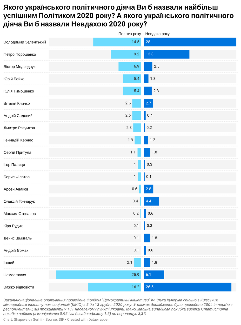 Политиком 2020 году украинцы чаще всего называют действующего президента Владимира Зеленского. Но он же возглавил народный рейтинг неудачников года.