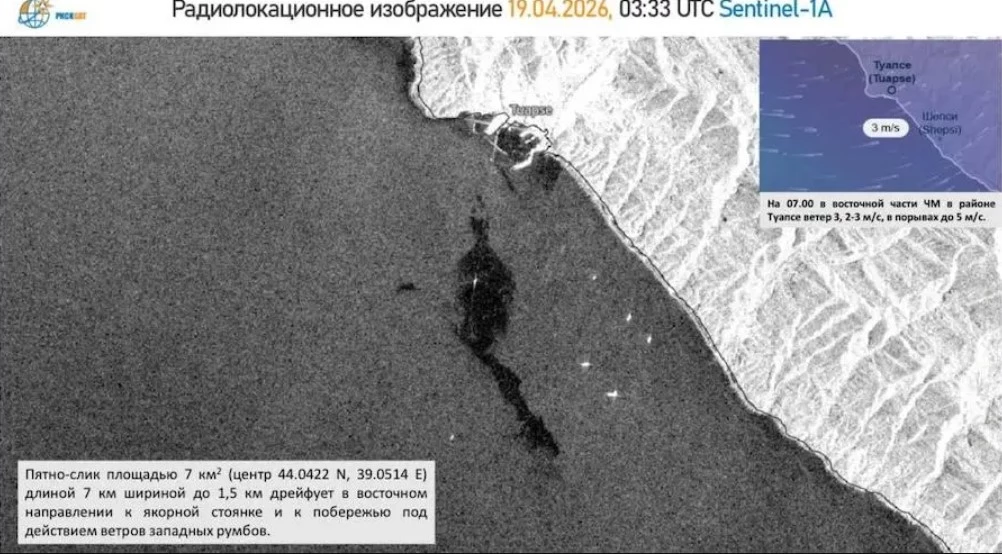 Кроме того, в оперативном штабе Краснодарского края заявили о нефтяном пятне, которое дрейфует у побережья Туапсе. Его площадь составляет около 10 тысяч квадратных метров. В сети был опубликован спутниковый снимок этого пятна, датированный 19 апреля. Это означает, что пятно образовалось в результате предыдущей атаки по НПЗ в минувший четверг, 16 апреля.