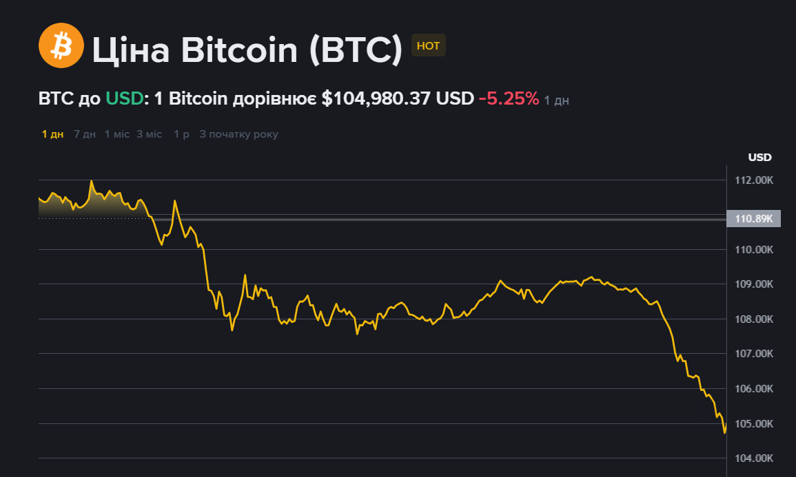 Раптове падіння відбулося після того, як біткойн на початку цього тижня ненадовго повернув собі рівень вище 110 000 доларів, що викликало надії на відновлення бичачого імпульсу.