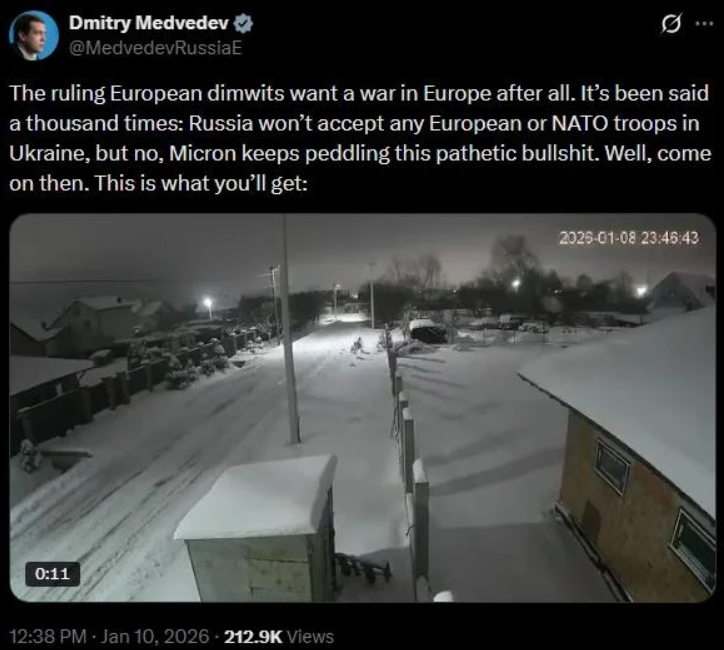 "Правлячі європейські тупиці все-таки хочуть війни в Європі. Це вже тисячу разів говорилося: Росія не прийме ніяких європейських або НАТОвських військ в Україні, але ні, Макрон (президент Франції Емманюель Макрон - УНІАН) продовжує поширювати цю жалюгідну нісенітницю. Ну, давайте ж. Ось що ви отримаєте", - написав Медведєв.